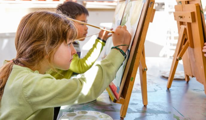 Our students work with different materials to learn techniques and make art. Our teachers guide them in building skills like creative thinking and problem-solving. Our students start to see the connections between art, history, and other subjects. They explore color, shapes, and textures, and find new ways to express themselves. By making and talking about art, they grow to appreciate and understand the world around them. Our students feel excited to share their work with others.